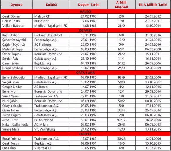 Emre'nin de yer aldığı A Milli Futbol Takımı'nın kadrosuna çağrılan futbolcular şunlar: